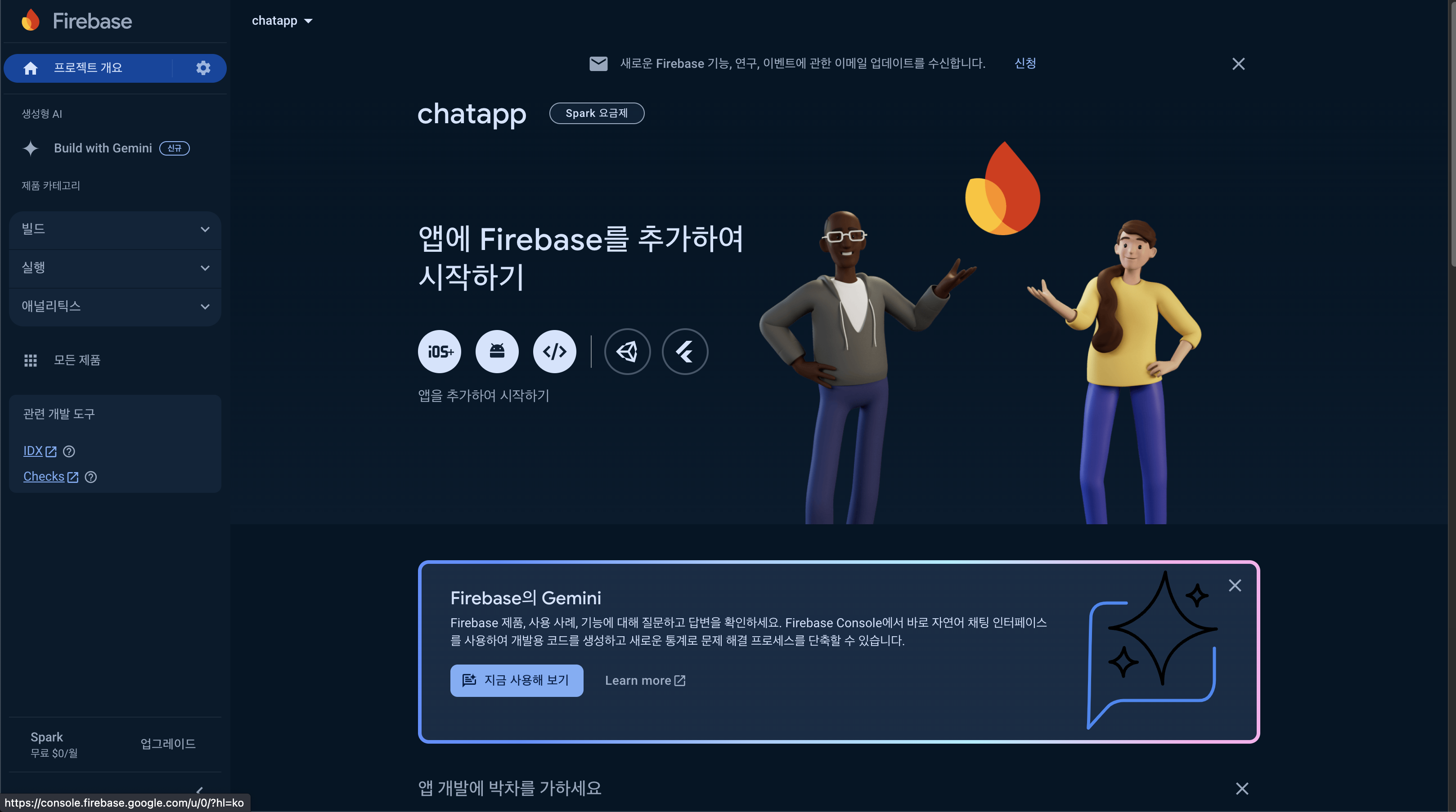 Firebase와 연동하기 위해서는 먼저 Firebase에 로그인해서 프로젝트를 생성하는 과정이 필요합니다.