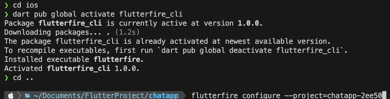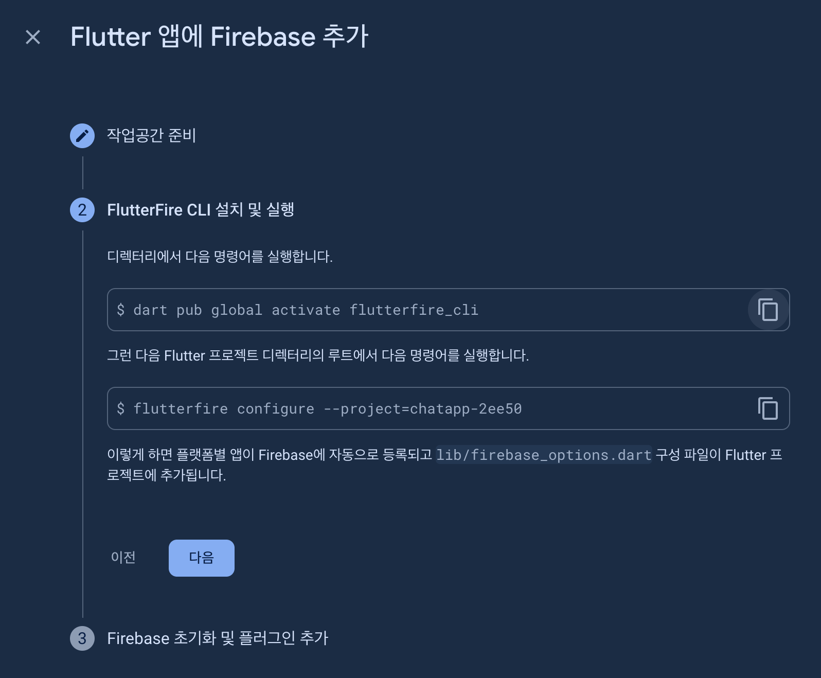그 다음 FlutterFire CLI를 실행하고 등록하는 과정을 진행합니다.