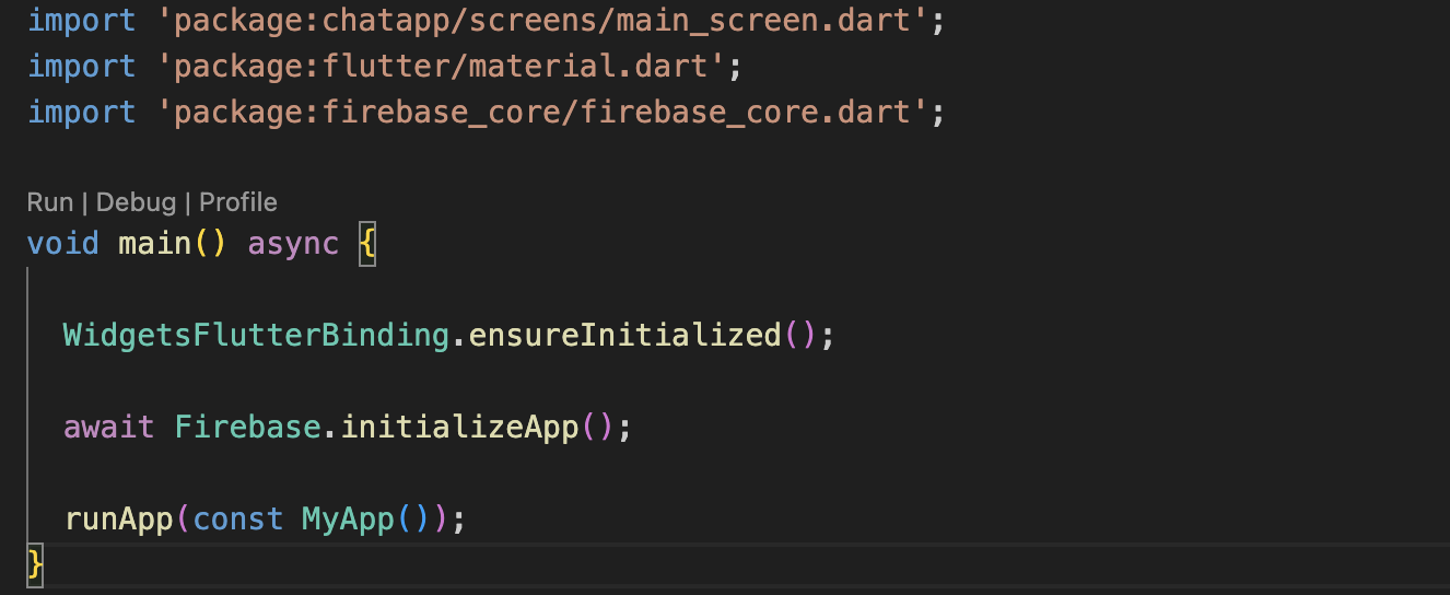 따라서 메인 메소드 내부에서 플러터 엔진과 관련된 Firebase 초기화와 같은 사용하려면 플러터 코어인증을 초기화시켜야 합니다.